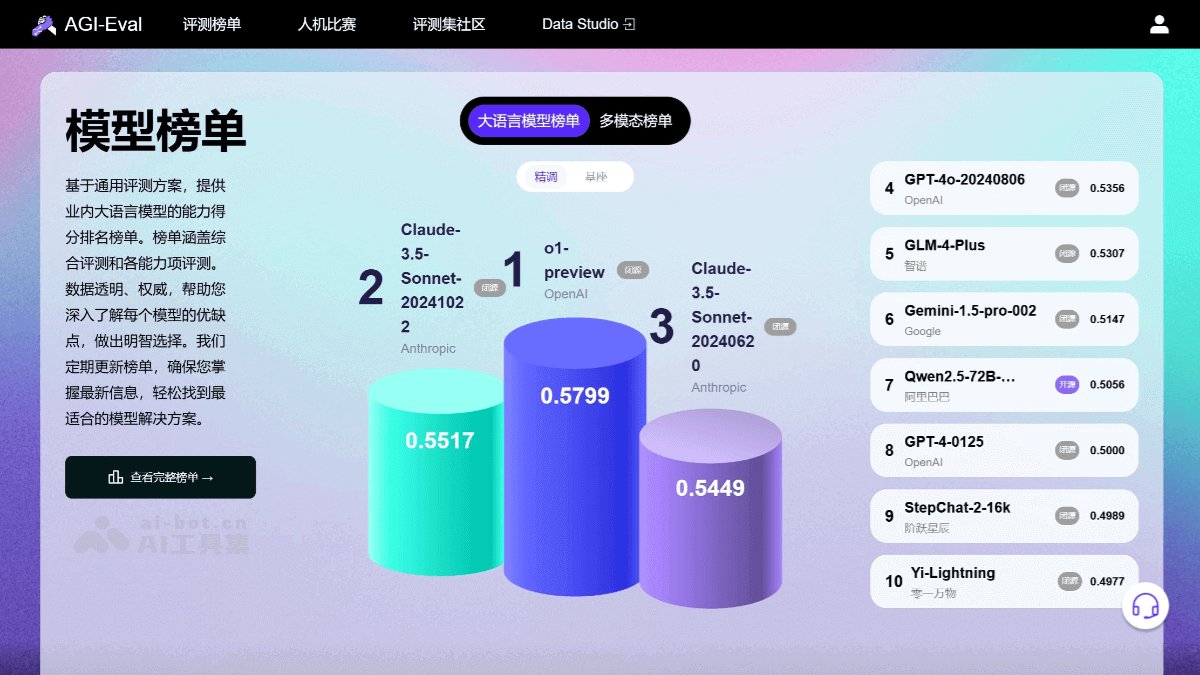 • 模型性能评估:AGI-Eval提供了完整数据集、基线系统评估和详细评估方法,是衡量AI模型综合能力的权威工具。
